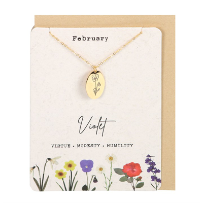 This lovely greeting card features a timeless wildflower design and holds a gold-tone necklace adorned with the recipient's birth flower, making it a thoughtful surprise for birthdays, Mother's Day, milestone moments and more. Symbolising virtue, modesty and humility, the violet flower is a meaningful token for those born in the month of February. Includes engraved flower charm on a 22cm nickel-free chain. Card left blank inside. Envelope included.