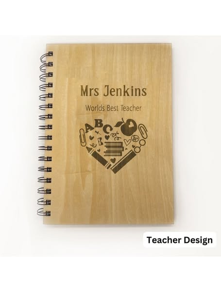 Be the envy of your work colleagues or school friends with this truly unique plywood covered notebook. Contains 75 sheets of lined paper. A5. Design 1: Engrave up to 2 lines, maximum of 15 characters per line. Teacher Design: Engrave up to 2 lines. Line 1: maximum 15 characters. Line 2: maximum 25 characters. Heart design is fixed.