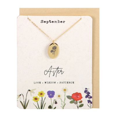 This lovely greeting card features a timeless wildflower design and holds a gold-tone necklace adorned with the recipient's birth flower, making it a thoughtful surprise for birthdays, Mother's Day, milestone moments and more. Symbolising love, wisdom and patience, the aster flower is a meaningful token for those born in the month of September. Includes engraved flower charm on a 22cm nickel-free chain. Card left blank inside. Envelope included.