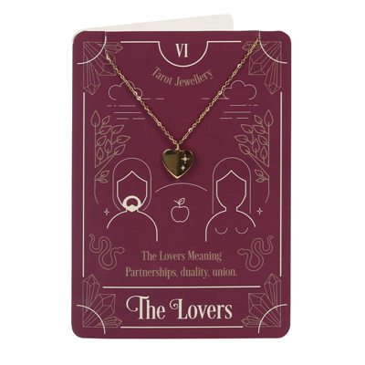 A mystical gold-tone heart necklace beautifully presented on a matching greeting card perfect for gifting. Inspired by the art of tarot reading and designed by Something Different as part of the Fortune Teller range of mystical gifts and homeware. 22cm chain with lobster clasp closure. Nickel-free stainless steel. Includes metallic envelope. Card left blank inside.
